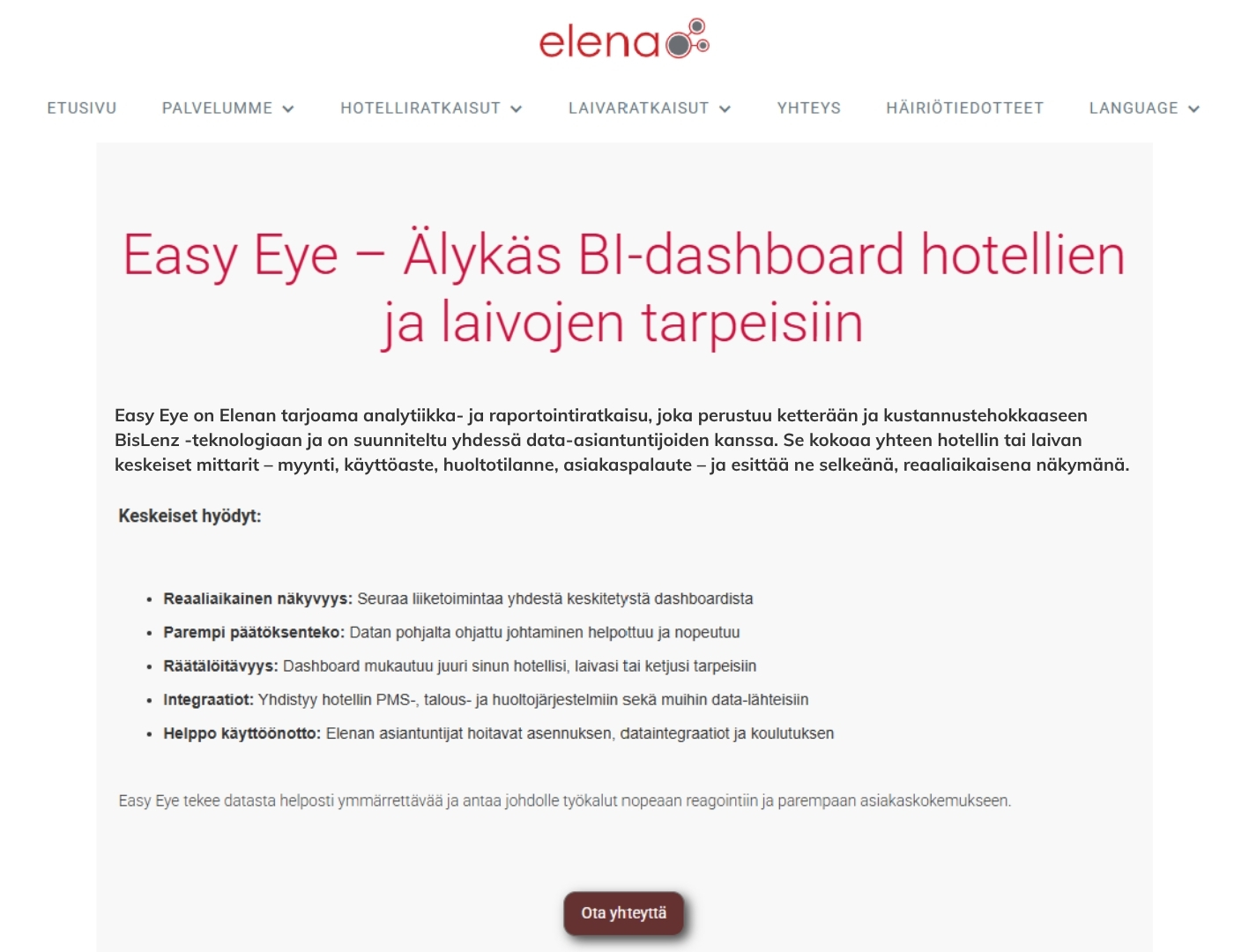 Elena Yhtiöt Oy on hotelli, – ja Maritime toimialan teknologiapalveluiden asiantuntija, joka auttaa yli 100 suomalaista hotellia sekä lukuisia laivayhtiöitä pysymään digitaalisen kehityksen kärjessä.