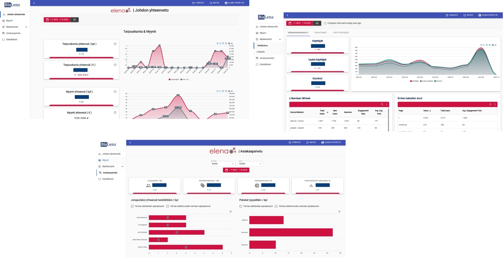 Elena päätti ottaa käyttöön BisLenzin alustan, jotta eri lähteistä tuleva data — esimerkiksi myynti- ja markkinointikanavat, asiakaskommunikaatio, verkkosivuanalytiikka sekä palautevirrat — saadaan yhteen käyttöliittymään, helposti seurattaviksi dashboardeiksi.