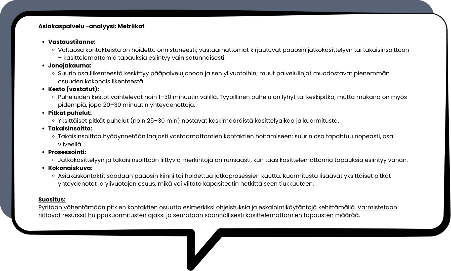 Tiedot voidaan yhdistää automaattisesti esimerkiksi vasteaikoihin, yhteydenottomääriin tai ratkaisuasteisiin, jolloin asiakasyritykset saavat selkeän kuvan siitä, miten palvelu toimii ja miten se koetaan.