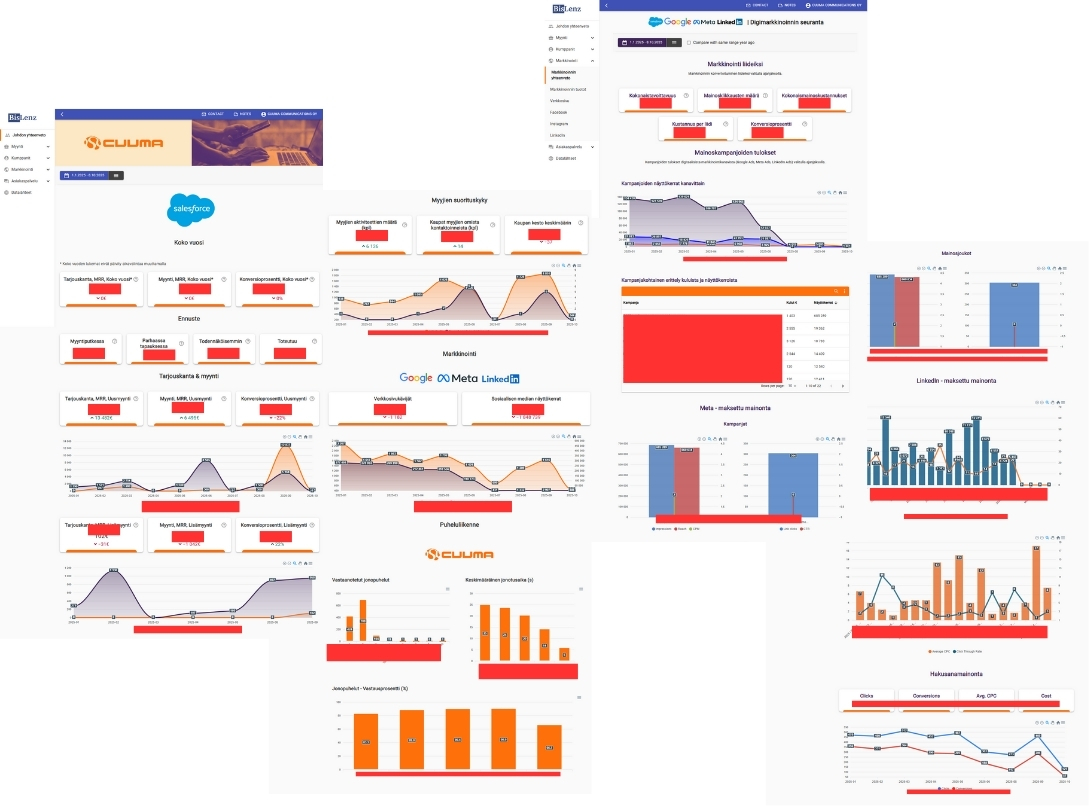 BisLenzin avulla Cuuma seuraa reaaliaikaisesti myynnin, markkinoinnin ja asiakaspalvelun tunnuslukuja yhdestä näkymästä. Tämä mahdollistaa nopeamman reagoinnin, parempia päätöksiä ja jatkuvan kehityksen.